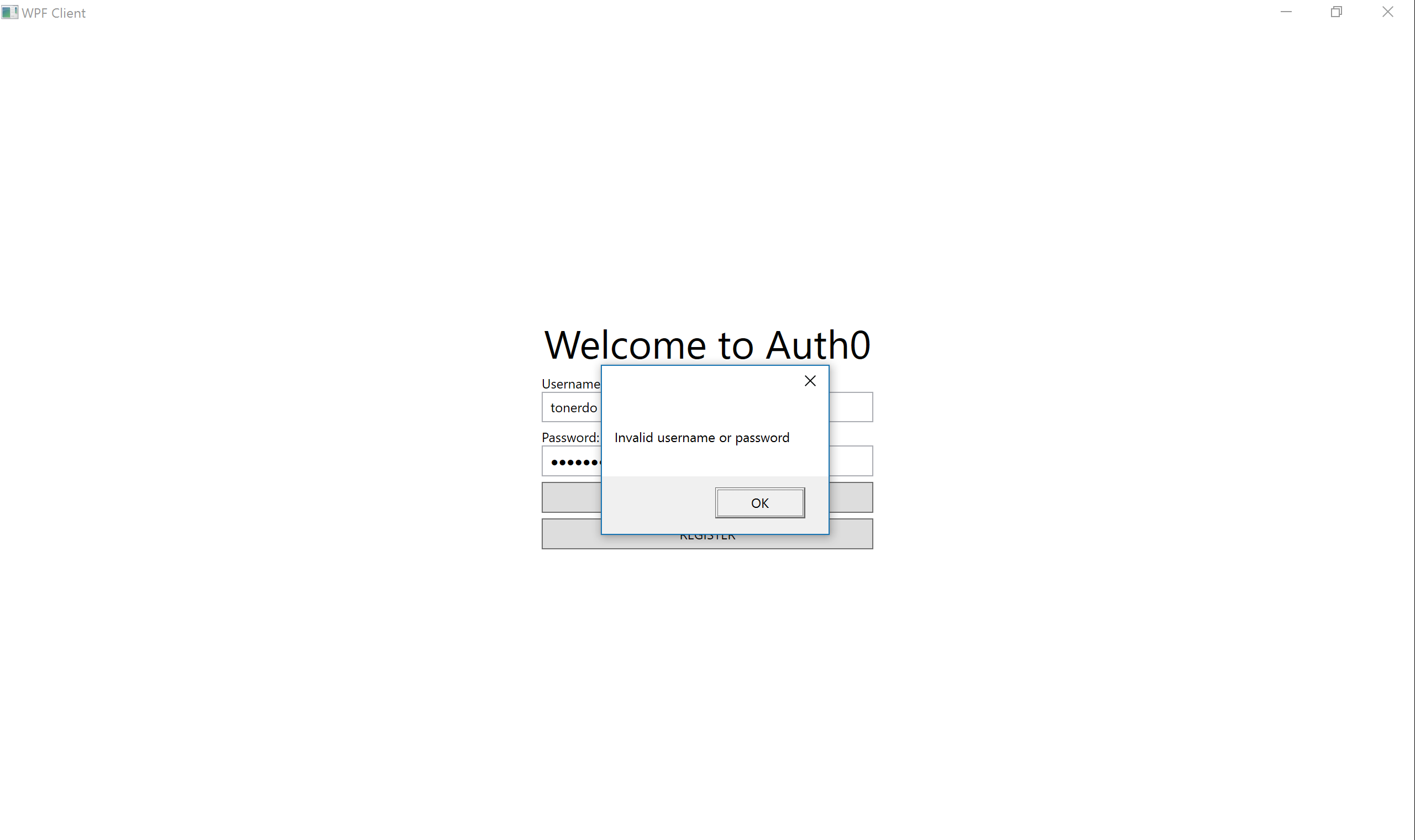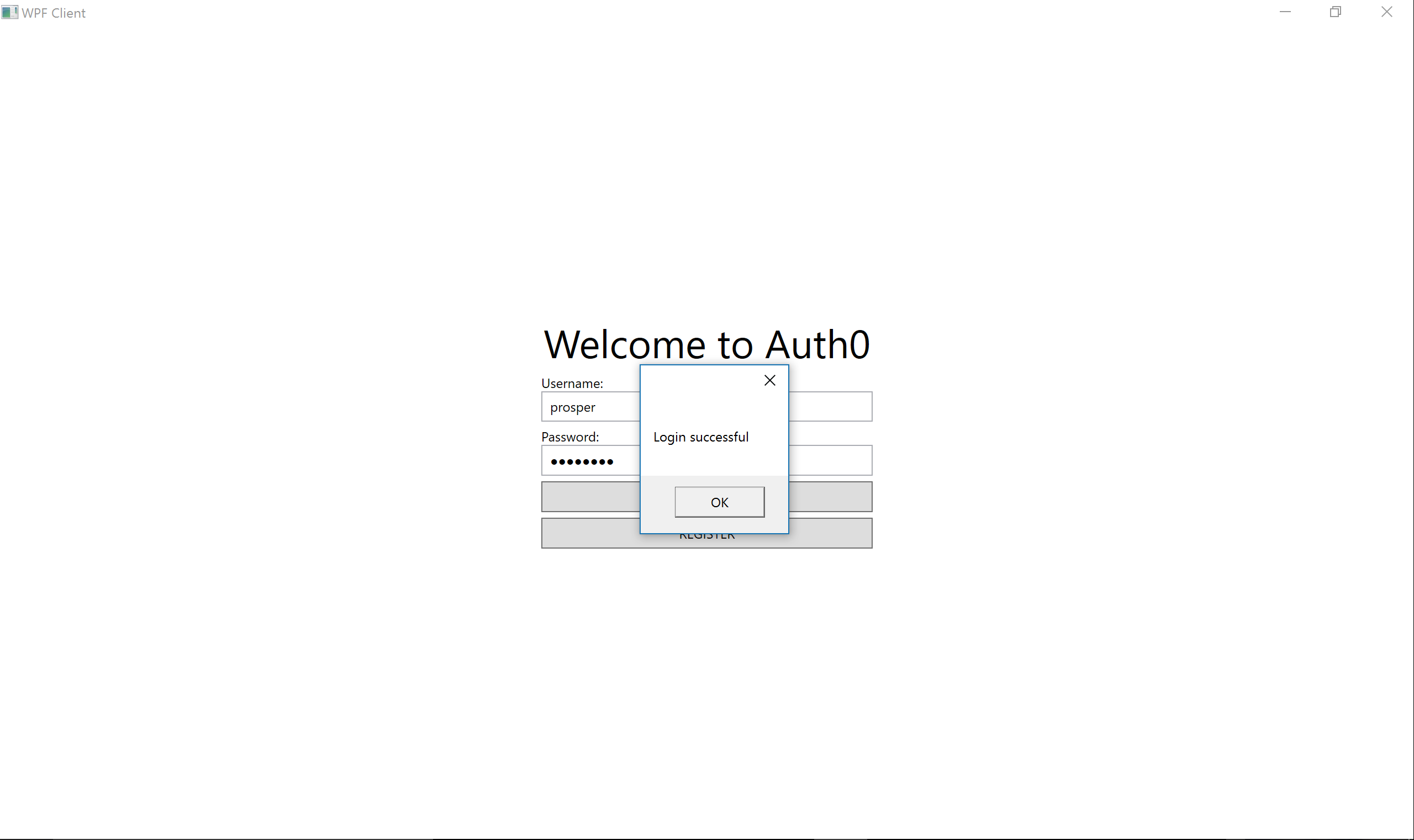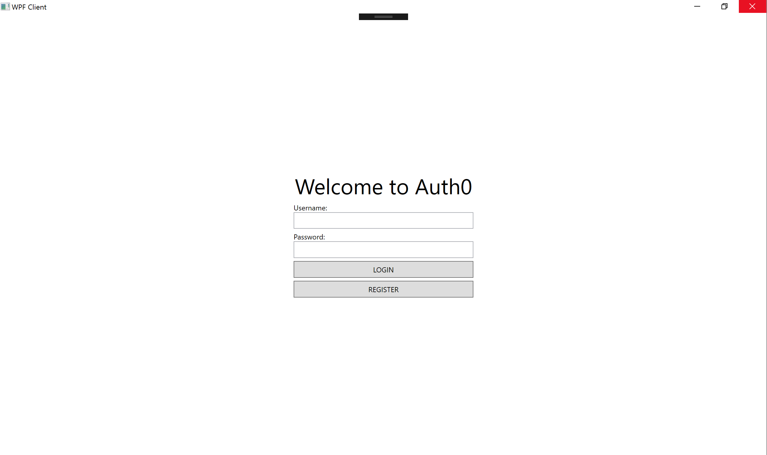 <Page x:Class="WpfClient.Pages.LoginPage" xmlns="http://schemas.microsoft.com/winfx/2006/xaml/presentation" xmlns:x="http://schemas.microsoft.com/winfx/2006/xaml" xmlns:mc="http://schemas.openxmlformats.org/markup-compatibility/2006" xmlns:d="http://schemas.microsoft.com/expression/blend/2008" xmlns:local="clr-namespace:WpfClient.Pages" mc:Ignorable="d" d:DesignHeight="485" d:DesignWidth="715" Title="Login"> <Grid> <StackPanel HorizontalAlignment="Center" Margin="0" VerticalAlignment="Center" Width="300"> <TextBlock Text="Welcome to Auth0" HorizontalAlignment="Center" FontSize="36" /> <TextBlock Text="Username:" Margin="0,5,0,0" /> <TextBox x:Name="tbxUsername" Padding="5" /> <TextBlock Text="Password:" Margin="0,5,0,0" /> <PasswordBox x:Name="pbxPassword" Padding="5" /> <Button x:Name="btnLogin" Content="LOGIN" Padding="5" Margin="0,5,0,0" Click="btnLogin_Click" /> <Button x:Name="btnRegister" Content="REGISTER" Padding="5" Margin="0,5,0,0" Click="btnRegister_Click" /> </StackPanel> </Grid> </Page>