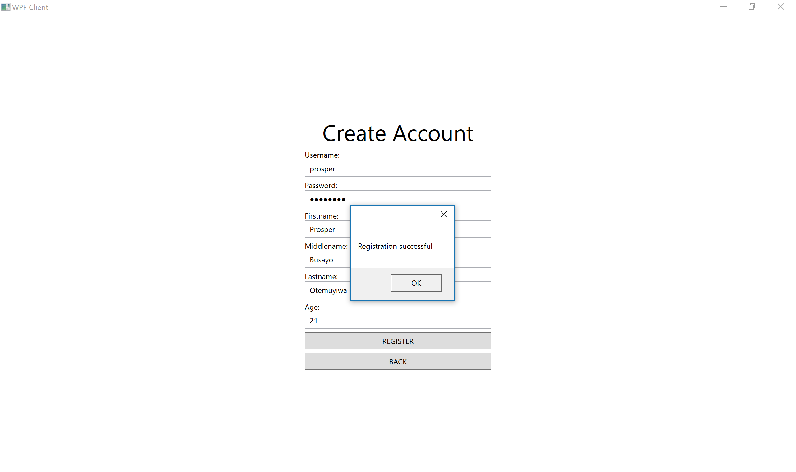 In the btnReg_Click method, we are obtaining the user's information from the form via the name attributes. Remember tbxUsername, pbxPassword, tbxFirstname, tbxLastname, tbxMiddlename and tbxAge are name attributes we gave the form during the UI setup. Then we called the RegisterUser method from the ApiOperations class we defined earlier. If the user already exists, it gives an error message, otherwise it registers the user and navigates to a new page to show the User details. NavigationService does the navigation.