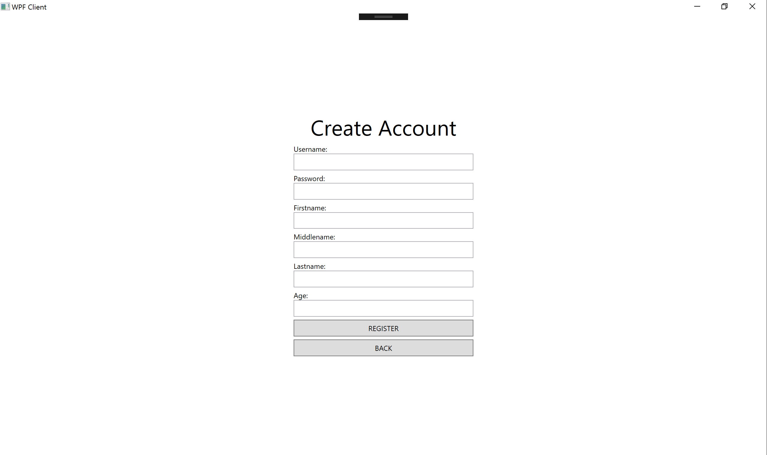 <Page x:Class="WpfClient.Pages.RegistrationPage" xmlns="http://schemas.microsoft.com/winfx/2006/xaml/presentation" xmlns:x="http://schemas.microsoft.com/winfx/2006/xaml" xmlns:mc="http://schemas.openxmlformats.org/markup-compatibility/2006" xmlns:d="http://schemas.microsoft.com/expression/blend/2008" xmlns:local="clr-namespace:WpfClient.Pages" mc:Ignorable="d" d:DesignHeight="300" d:DesignWidth="300" Title="RegistrationPage"> <Grid> <StackPanel HorizontalAlignment="Center" Margin="0" VerticalAlignment="Center" Width="300"> <TextBlock Text="Create Account" HorizontalAlignment="Center" FontSize="36" /> <TextBlock Text="Username:" Margin="0,5,0,0" /> <TextBox x:Name="tbxUsername" Padding="5" /> <TextBlock Text="Password:" Margin="0,5,0,0" /> <PasswordBox x:Name="pbxPassword" Padding="5" /> <TextBlock Text="Firstname:" Margin="0,5,0,0" /> <TextBox x:Name="tbxFirstname" Padding="5" /> <TextBlock Text="Middlename:" Margin="0,5,0,0" /> <TextBox x:Name="tbxMiddlename" Padding="5" /> <TextBlock Text="Lastname:" Margin="0,5,0,0" /> <TextBox x:Name="tbxLastname" Padding="5" /> <TextBlock Text="Age:" Margin="0,5,0,0" /> <TextBox x:Name="tbxAge" Padding="5" /> <Button x:Name="btnReg" Content="REGISTER" Padding="5" Margin="0,5,0,0" Click="btnReg_Click" /> <Button x:Name="btnBack" Content="BACK" Padding="5" Margin="0,5,0,0" Click="btnBack_Click" /> </StackPanel> </Grid> </Page>