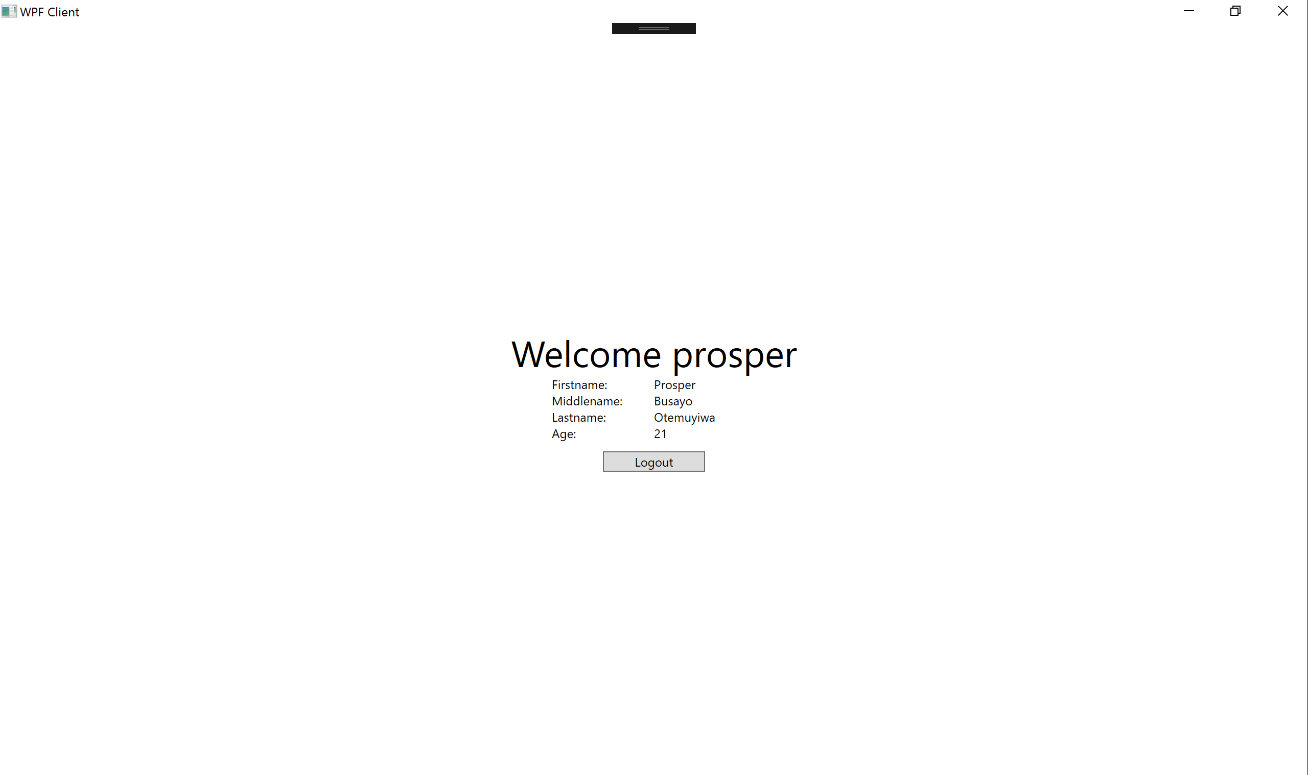 <Page x:Name="detailsPage" x:Class="WpfClient.Pages.DetailsPage" xmlns="http://schemas.microsoft.com/winfx/2006/xaml/presentation" xmlns:x="http://schemas.microsoft.com/winfx/2006/xaml" xmlns:mc="http://schemas.openxmlformats.org/markup-compatibility/2006" xmlns:d="http://schemas.microsoft.com/expression/blend/2008" xmlns:local="clr-namespace:WpfClient.Pages" mc:Ignorable="d" d:DesignHeight="455" d:DesignWidth="640" Title="DetailsPage" Loaded="detailsPage_Loaded"> <Grid> <StackPanel Margin="0" VerticalAlignment="Center"> <TextBlock x:Name="tbkWelcome" Text="Welcome" HorizontalAlignment="Center" FontSize="36" /> <Grid HorizontalAlignment="Center" Width="200"> <Grid.RowDefinitions> <RowDefinition Height="Auto" /> <RowDefinition Height="Auto" /> <RowDefinition Height="Auto" /> <RowDefinition Height="Auto" /> </Grid.RowDefinitions> <Grid.ColumnDefinitions> <ColumnDefinition Width="100" /> <ColumnDefinition Width="Auto" /> </Grid.ColumnDefinitions> <TextBlock Text="Firstname:" Grid.Row="0" Grid.Column="0" /> <TextBlock Text="Middlename:" Grid.Row="1" Grid.Column="0" /> <TextBlock Text="Lastname:" Grid.Row="2" Grid.Column="0" /> <TextBlock Text="Age:" Grid.Row="3" Grid.Column="0" /> <TextBlock x:Name="tbkFname" Text="Firstname" Grid.Row="0" Grid.Column="1" /> <TextBlock x:Name="tbkMname" Text="Middlename" Grid.Row="1" Grid.Column="1" /> <TextBlock x:Name="tbkLname" Text="Lastname" Grid.Row="2" Grid.Column="1" /> <TextBlock x:Name="tbkAge" Text="Age" Grid.Row="3" Grid.Column="1" /> </Grid> <Button x:Name="btnLogout" Content="Logout" Width="100" Click="btnLogout_Click" Margin="0,10,0,0" /> </StackPanel> </Grid> </Page>