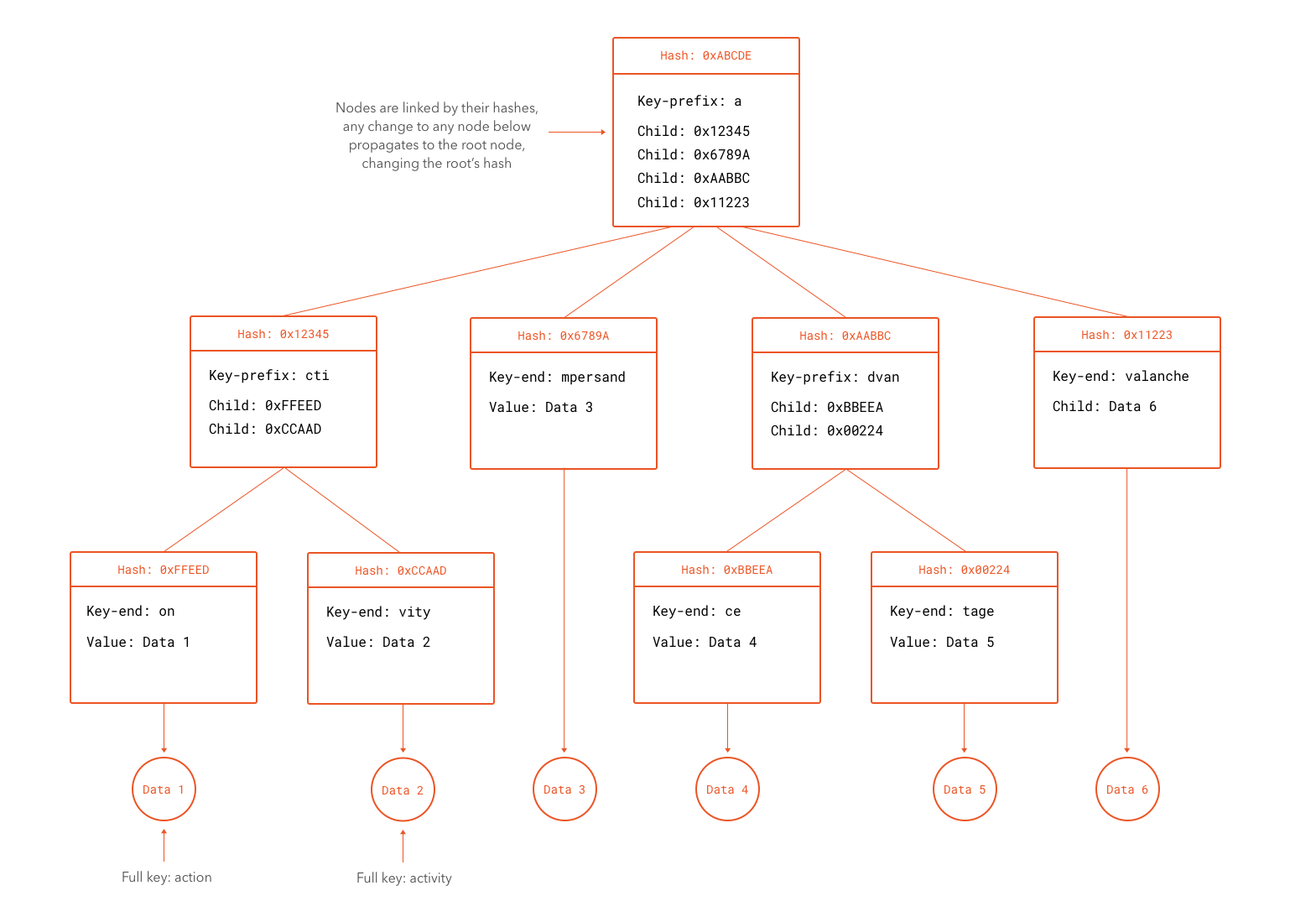 A Merkle Patricia Tree is a special kind of data structure that can store cryptographically authenticated data in the form of keys and values. A Merkle Patricia Tree with a certain group of keys and values can only be constructed in a single way. In other words, given the same set of keys and values, two Merkle Patricia Trees constructed independently will result in the same structure bit-by-bit. A special property of Merkle Patricia Trees is that the hash of the root node (the first node in the tree) depends on the hashes of all sub-nodes. This means that any change to the tree results in a completely different root hash value. Changes to a leaf node cause all hashes leading to the root hash through that and sister branches to be recomputed. What we have described is in fact the "Merkle" part of the tree, the "Patricia" part comes from the way keys are located in the tree. Patricia trees are tries where any node that is an only child is merged with its parent. They are also known as "radix trees" or "compact prefix trees". A trie is a tree structure that uses prefixes of the keys to decide where to put each node.