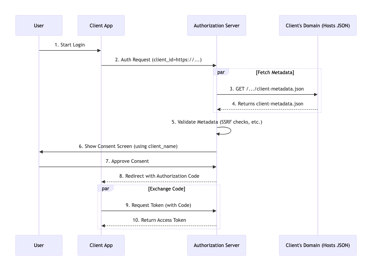 client_nameandlogo_uri. The server then caches this metadata for a period (for example, 24 hours). This means it does not need to fetch it again for subsequent requests from that client.