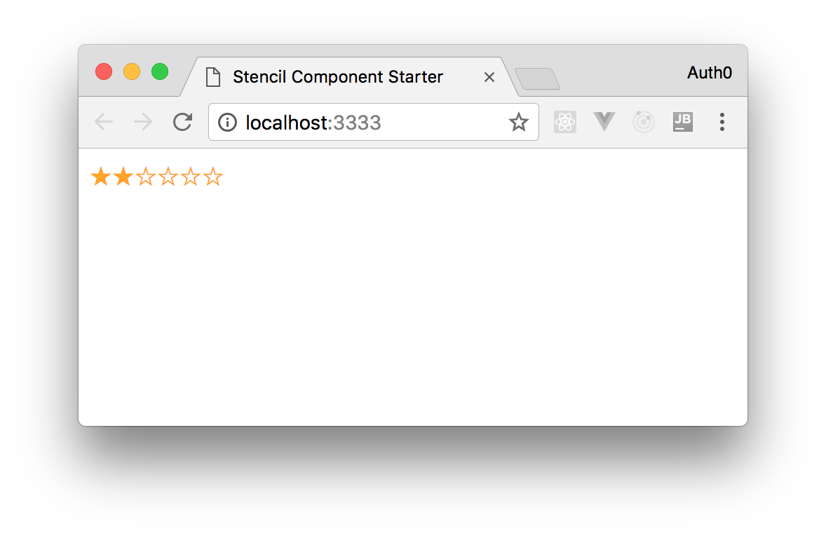As you can see, the body of the HTML page contains the newly defined <my-rating> tag that identifies our component. After saving the index.html file, type npm start in a console window, and you will see your component in a browser as in the following picture: