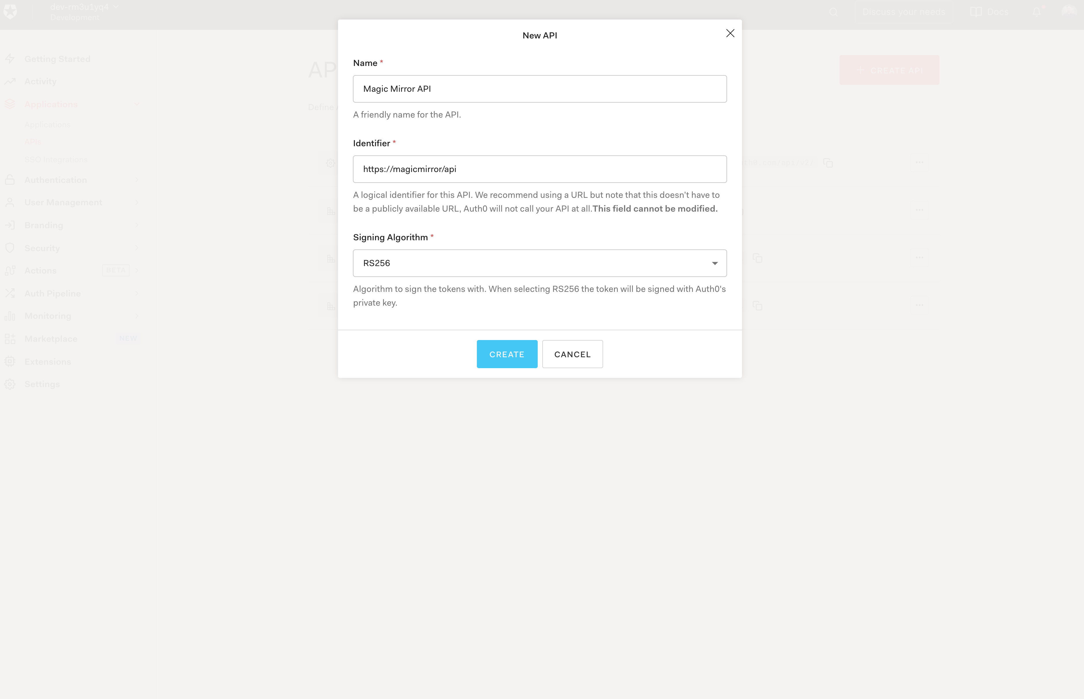 Next up, we'll need to create an Auth0 API. We want to protect the ExpressJS route that does the actual updating of the text sent to the magic mirror.