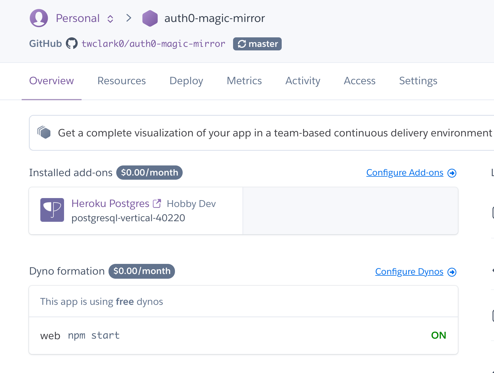 You'll then need to host this site, preferably somewhere that gives you a database to work with. I went with Heroku because it provides both the hosting and the Postgres database free of charge.