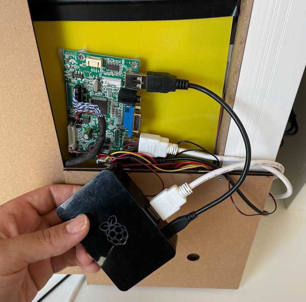 As you can see in the picture above, you'll need to connect to the Raspberry Pi to the mirror monitor's board with HDMI cable for the video feed and a USB-A-to-micro USB cable to provide power to the Pi.