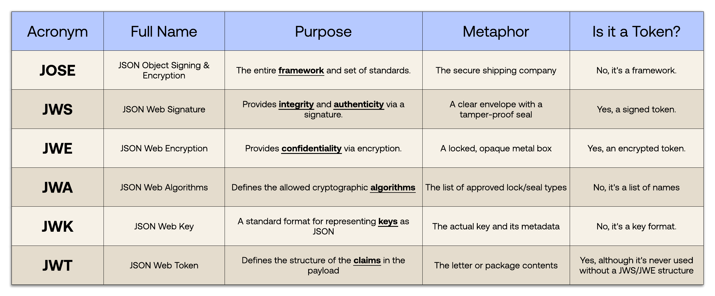 If you've worked with modern authentication or secure data exchange, you've undoubtedly encountered JSON Web Tokens, or JWTs. However, if you dig deeper, you may encounter a series of confusing acronyms: JWS, JWE, JWK, JWA, and the umbrella term, JOSE. What do they all mean? How do they relate to each other?