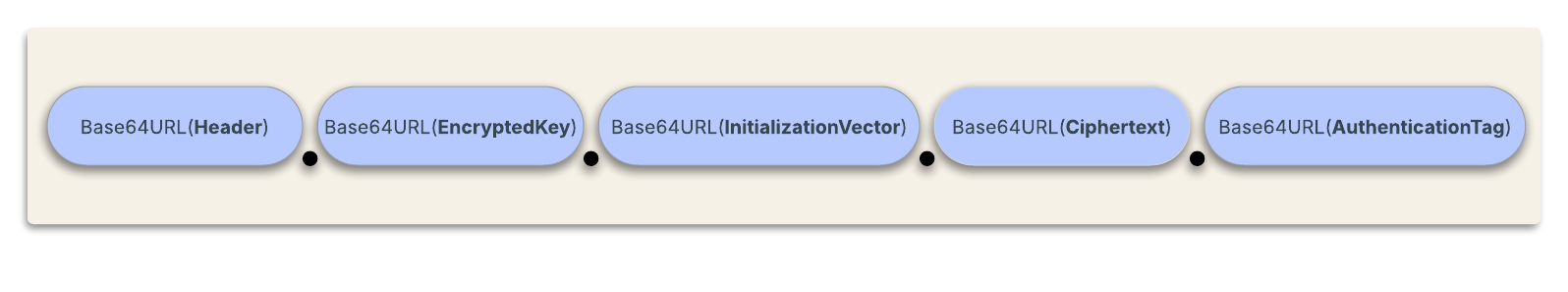A JWE object, or more simply a JWE, can also be represented in a compact string, but it has five parts separated by dots (.
