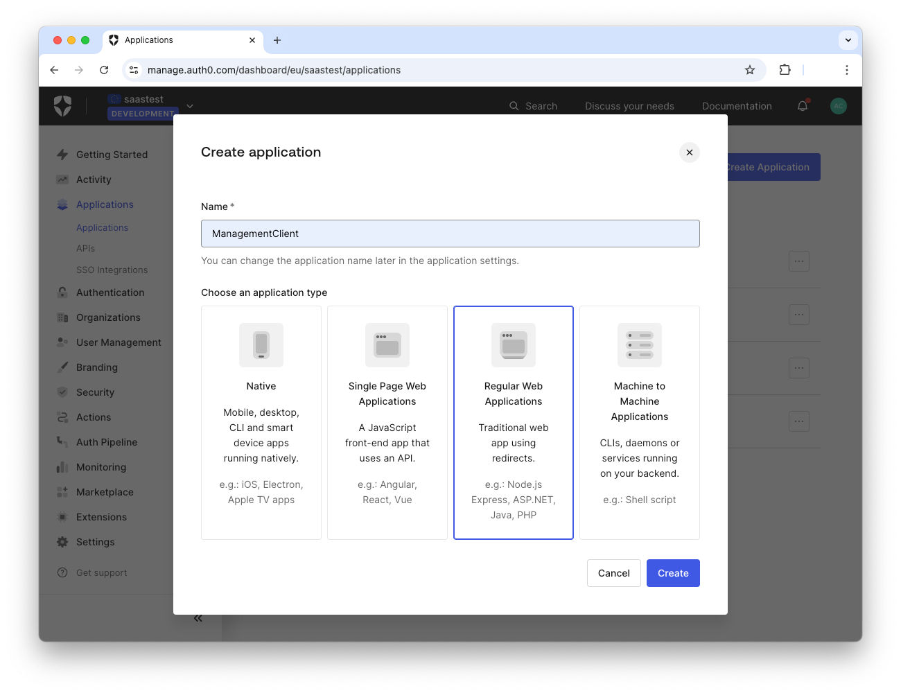 As a first step, access your Auth0 dashboard and register a new regular web app as shown in the following image: