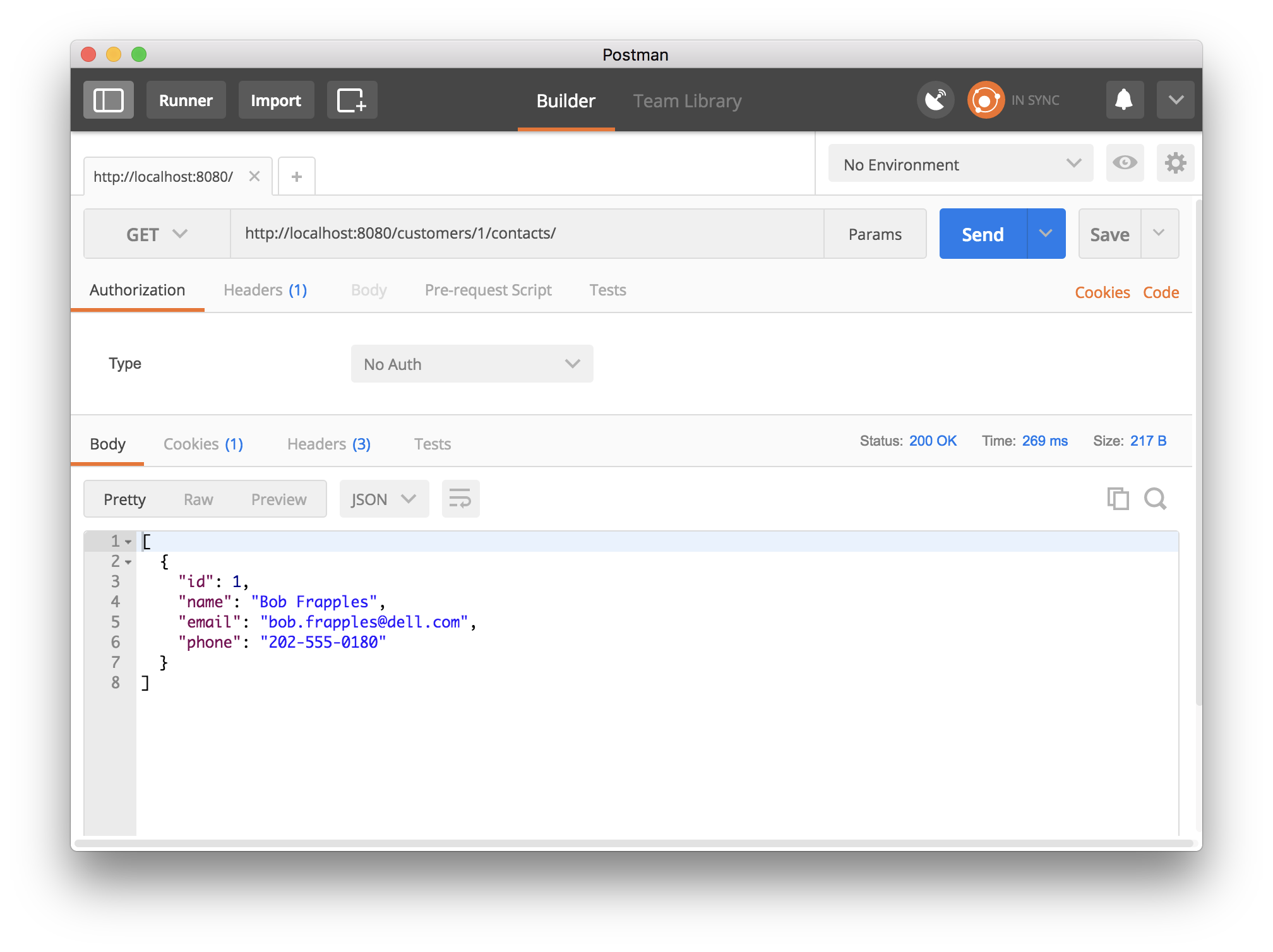 package com.auth0.samples; // other imports import org.springframework.web.bind.annotation.PathVariable; @RestController public class CustomerController { // customerRepository definition and getCustomers() method @RequestMapping(path = "/customers/{customerId}/contacts/", method = RequestMethod.GET) public List<Contact> getCustomerContacts(@PathVariable("customerId") Long customerId) { return customerRepository.findOne(customerId).getContacts(); } }