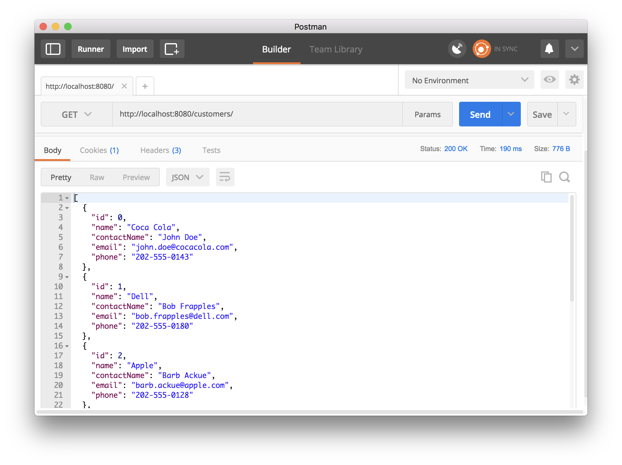 As our application was properly configured, and Flyway got a chance to run the script, we can now issue GET requests to /customers/ without a problem. The following screenshot shows the result of a GET request issued using Postman—which is a great tool to use when developing RESTful endpoints.