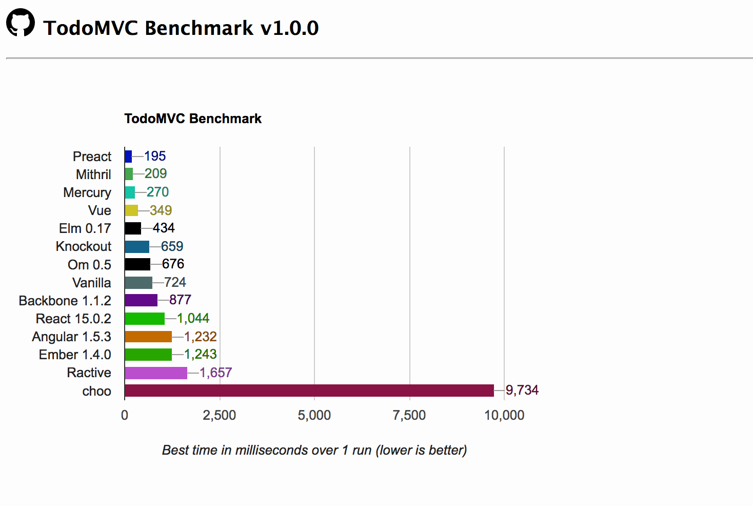 I used preact-perf to run tests with different JavaScript frameworks for a Todo app, and this was the result below: