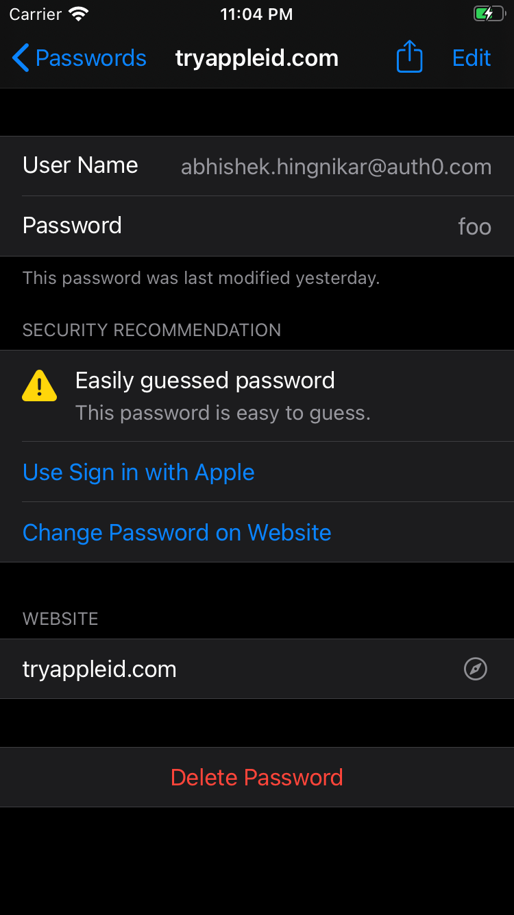 Apple uses something called an App Extension to power the button that upgrades a weak password to Sign in with Apple. If you are unfamiliar with iOS nitty-gritty, an App Extension can be thought of as a service, intent, or an action handler. These are single-purpose micro-apps with specific entry and exit points. They are iOS triggered events that let a developer return a custom action in response. This is similar in concept to Auth0’s Hooks and Rules, but in this case, all of this is on the iOS client.