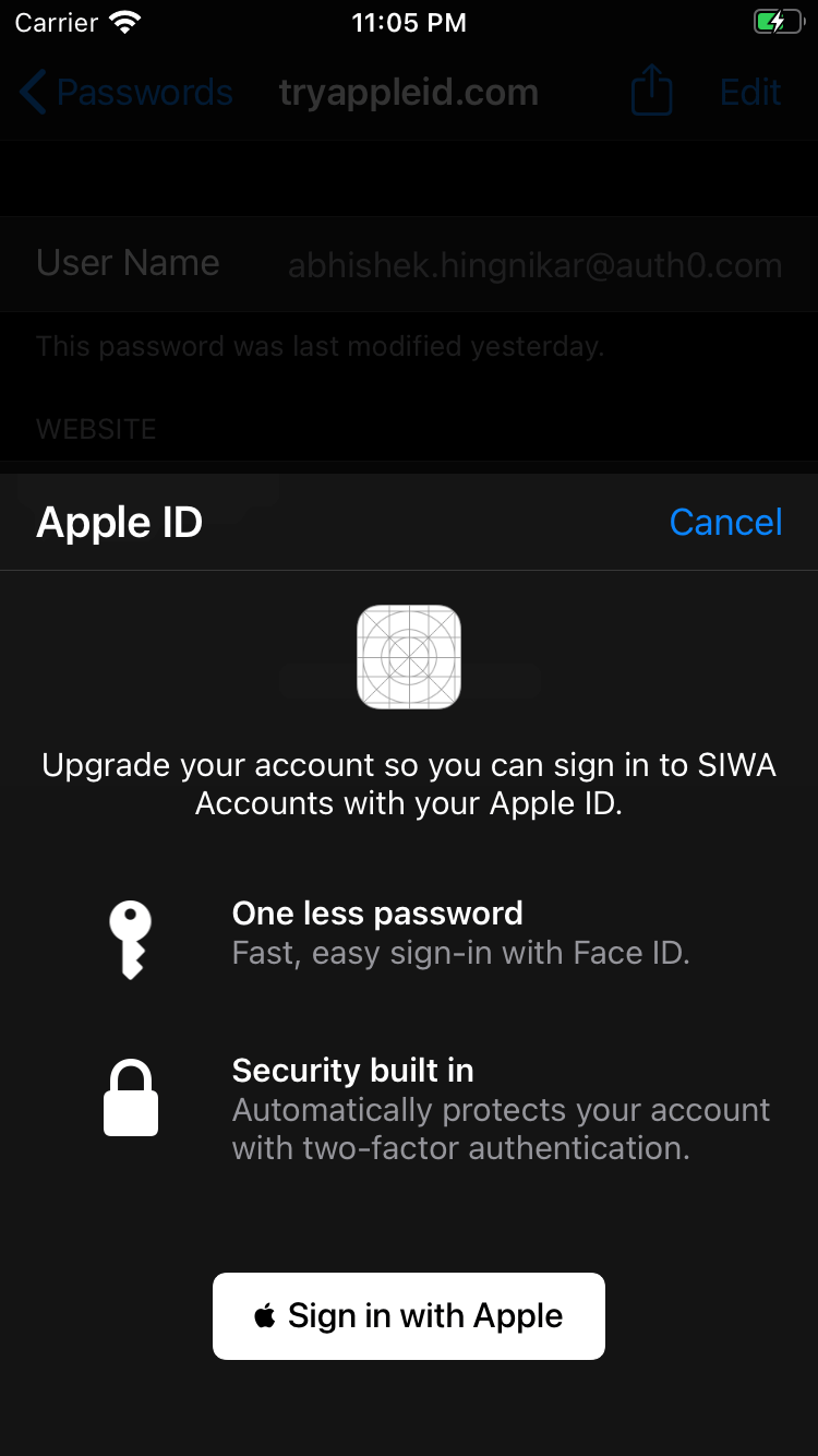 - The user taps on Upgrade to Sign in with Apple.