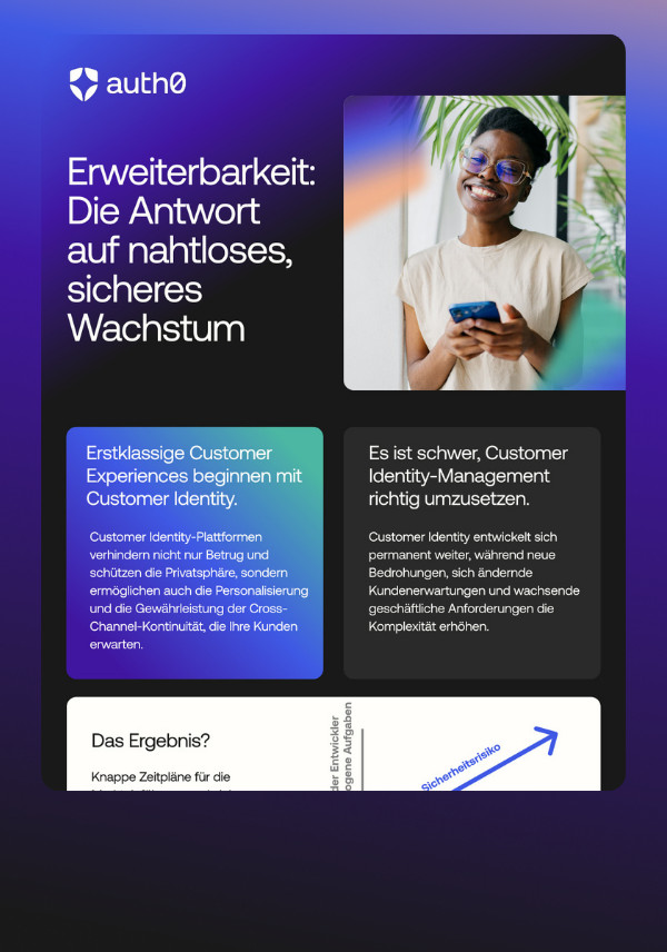 Die Customer Identity-Anforderungen verändern sich schnell und häufig. Sicherheitsbedrohungen entwickeln sich weiter. Die Prioritäten von Produktteams verändern sich. Features müssen zügig eingeführt werden. In dieser Infografik erfahren Sie, warum Erweiterbarkeit eine wichtige Eigenschaft moderner CIAM-Lösungen ist und wie Sie ohne großen Entwicklungsaufwand flexibel bleiben, Funktionen schneller umsetzen und Identities absichern können. Sie erfahren mehr zu diesen Themen: - Was Erweiterbarkeit bei einer modernen CIAM-Lösung bedeutet - Wie Sie Sicherheit, Compliance und Innovation unterstützen, ohne ständig Code neu schreiben zu müssen - Welche Vorteile No-Code-, Low-Code- und Pro-Code-Optionen bieten - Wie Sie mit Auth0 Ihre Authentifizierungsabläufe erweitern und diese in Ihren Stack integrieren können