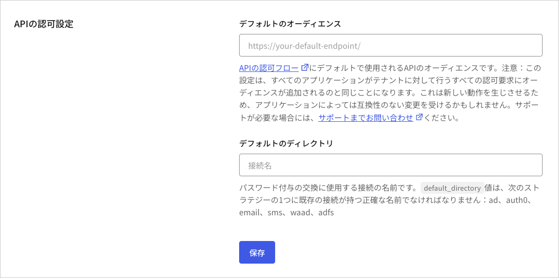 - Default (デフォルトのオーディエンス) :認可フローに使用されるAPI識別子です。値を入力すると、Auth0が発行したすべてのアクセストークンでこのAPI識別子がオーディエンスとして指定されます。Default Audience(デフォルトのオーディエンス) を設定すると、すべてのアプリケーションについて、テナントに対するすべての認可要求にこのオーディエンスを追加することになります。これは新しい振る舞いを生じさせるため、互換性が保てなくなるアプリケーションがでてしまうかもしれません。お困りの場合には、サポートまでご連絡ください。