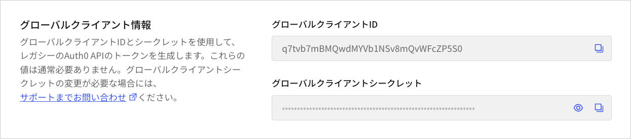 Global (グローバルクライアントID) と Global (グローバルクライアントシークレット) は、Auth0のレガシーAPIのためのトークンを生成するのに使用されます。通常、これらの値は必要ありません。グローバルクライアントシークレットの変更が必要な場合には、サポートまでご連絡ください。