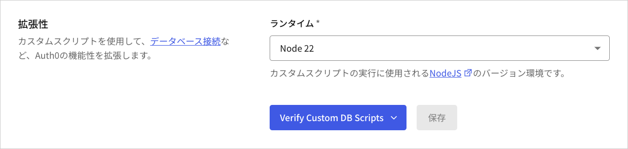 - Runtime(ランタイム) :カスタムデータベースのアクションスクリプトやカスタムソーシャル接続などのAuth0拡張機能に使用するNode.jsランタイム環境のバージョンを選択します。
