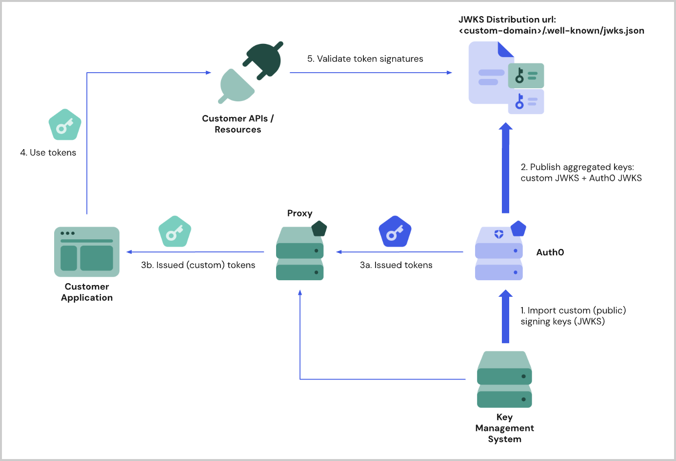 - The public part of the signing key is imported to Auth0 and pend publication to Auth0 keys as an aggregated JWKS.