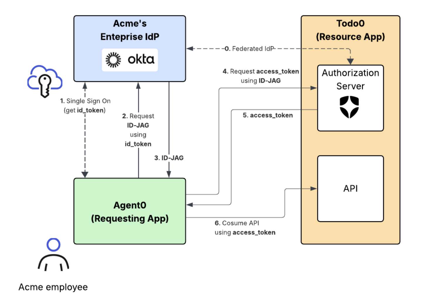 In the following diagram, Acme is the enterprise customer whose employees authenticate with their enterprise IdP, such as Okta, to access the Requesting App (Agent0) and the Resource App (Todo0):