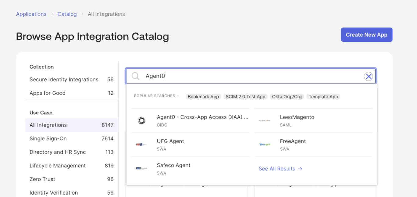 For a quick test setup, we recommend using the Agent0 application that is already registered in the OIN. In the Okta Admin Console, go to Applications > Applications > Browse App Catalog and search for