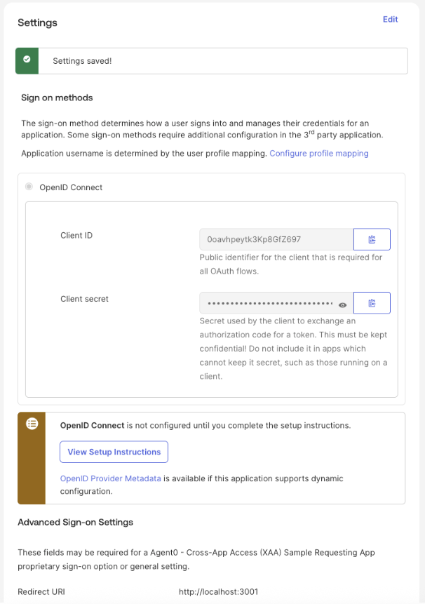 Update the Redirect URI field to the callback URL of your testing application that acts as your Requesting App in your Okta tenant, as explained in Register the Requesting App in Okta.