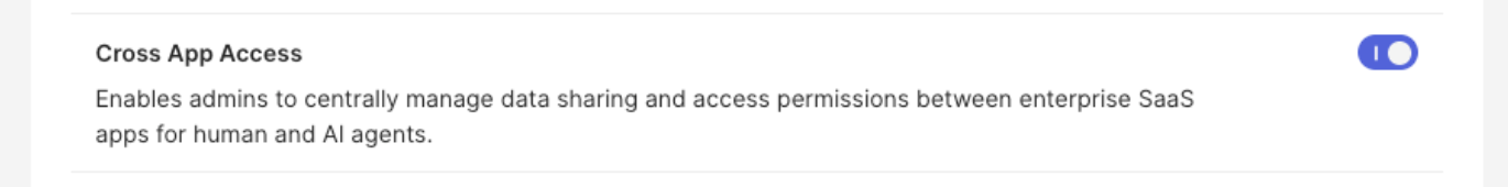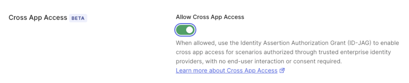 Manage Cross App Access in Okta: Configure agent-to-app and app-to-app connections in the Okta Admin Console. To learn more, read Manage Cross App Access in Okta.