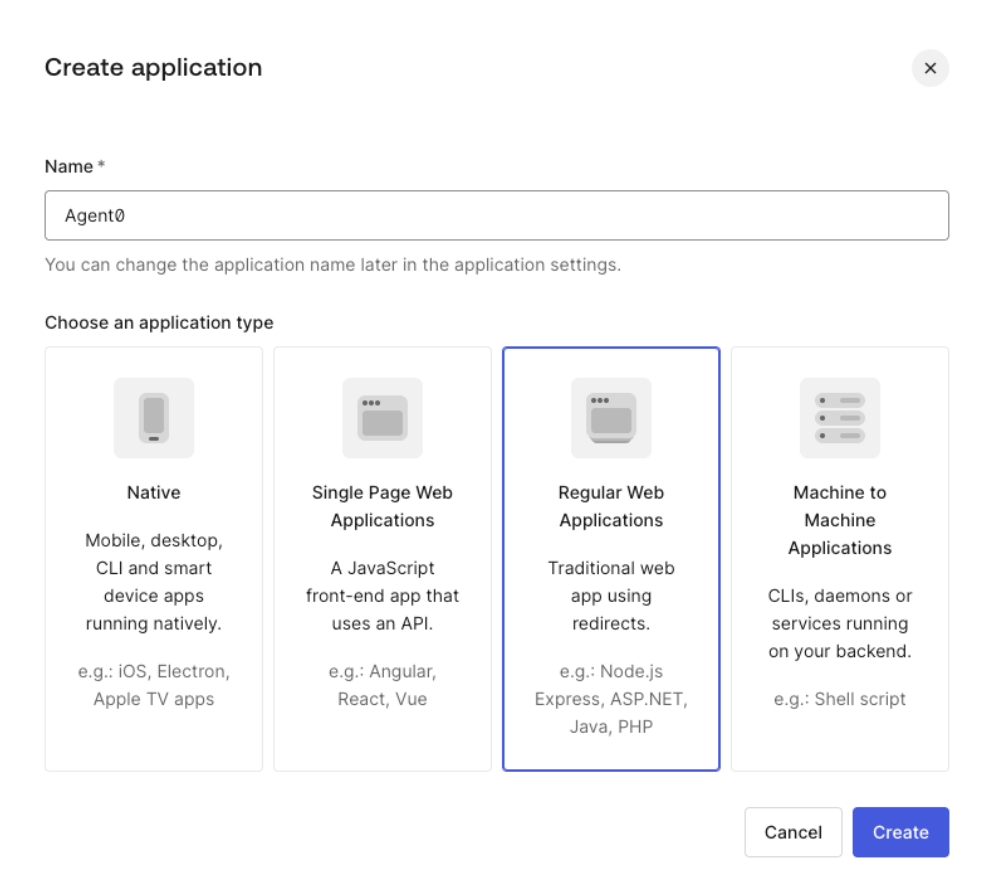 In the Auth0 Dashboard, create an application, such as a regular web app, SPA, or native app, that serves as the primary interface for end-users to access your SaaS application functionality.