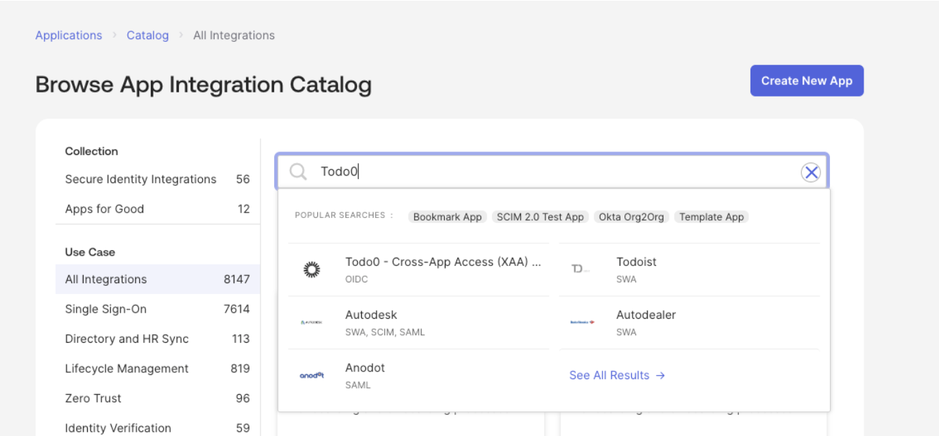 For a quick test setup, we recommend using the Todo0 application that is already registered in the OIN. In the Okta Admin Console, go to Applications > Applications > Browse App Catalog and search for