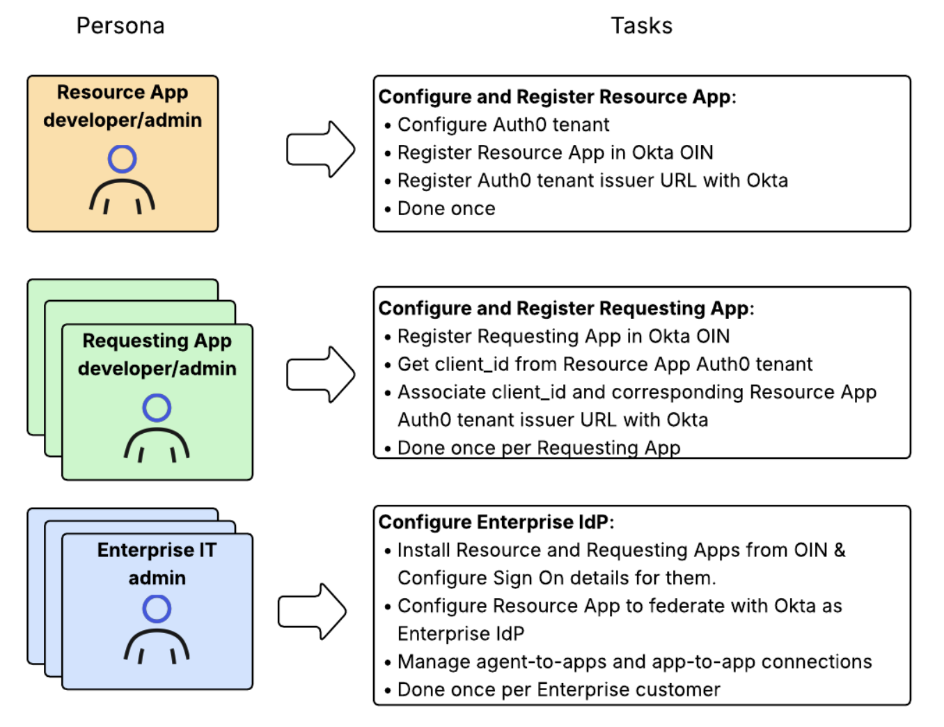 The following image maps the responsibilities of the different personas in a production-ready XAA flow: