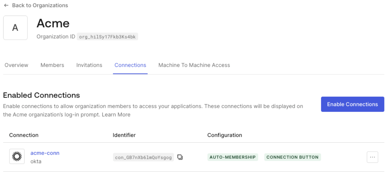 Configure how your Auth0 tenant federates with your customer’s enterprise IdP: In our test environment, the enterprise IdP will be your Okta test tenant, representing one of your enterprise customers. To learn more, read Federate with the enterprise IdP and Organization configuration.