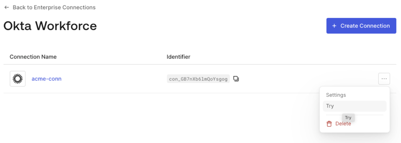 Go back to the list of Okta Workforce connections. Click the three dots on the right for your connection and click Try. You will be redirected to authenticate in your Okta tenant to complete the login with your test user.