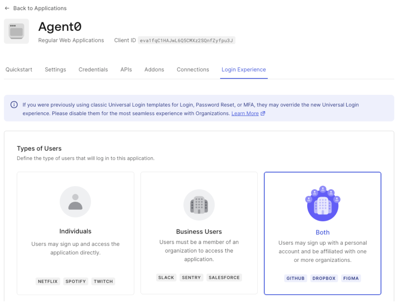 You can also configure the Requesting App’s Organization behavior to set whether it is required or allowed to use Organizations. We recommend that you start testing with Both, which allows users to log in as an Organization member or sign up with a personal account.
