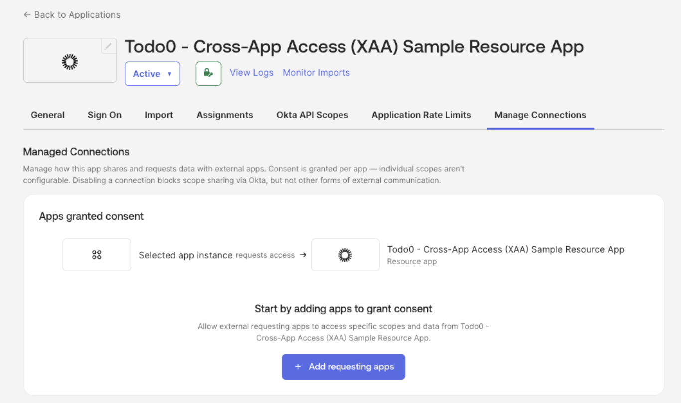 Once you've finished setting up your end-to-end test environment, you can manage how valid XAA applications can connect to each other in the Okta Admin Console.