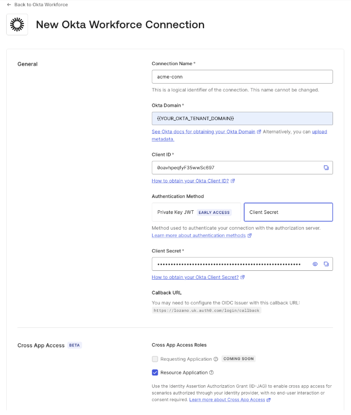 After creating the Okta Workforce Enterprise connection, copy the callback URL provided by Auth0 in the connection's settings. You need the callback URL to configure the sign-on policies of the Resource App in your Okta tenant.