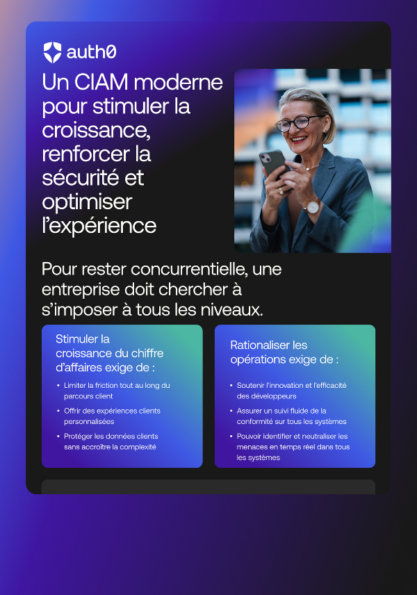 Lorsque vous perdez le contrôle de vos identités, tout se complique : les connexions ne fonctionnent plus comme elles le devraient, le cloisonnement s'aggrave et les failles de sécurité apparaissent. Cette infographie illustre comment une stratégie CIAM moderne, orientée développeurs, vous aide à préserver la connectivité de vos systèmes, à réduire la complexité et à soutenir votre équipe sans devoir constamment ajouter du code personnalisé. Téléchargez-le pour découvrir : - Comment éliminer les silos d'identité et unifier l'accès - Les méthodes pour sécuriser le parcours client avant, pendant et après la connexion - Comment un CIAM moderne accélère le lancement des produits et limite les efforts de développement - Ce qu'il faut attendre d'une plateforme CIAM flexible et évolutive telle qu'Auth0